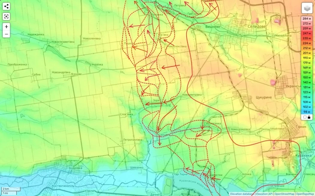 Кроме того, зафиксировано продвижение российских сил и вдоль трассы на Покровск.
