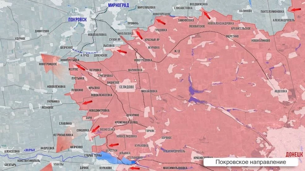 На Покровском направлении Минобороны объявило освобождение Берестков. Наши срезали карман между Старыми Тернами и Сонцовкой. Штурмуя северо-западную часть Солнцовки, продвинулись в полях по направлению к Заре. Формируя южный охват Покровска, наши выровняли линию между Жёлтым и Пушкино, а после освобождения Новопустынки вошли в Новотроицкое и Шевченко. И по последним данным ВС РФ уже зачищают Новотроицкое, из которого противник после неудачной контратаки, потеряв колонну техники, отвел войска в соседнюю Успеновку. Эту Успеновку не надо путать с селом на р. Сухие Ялы.
