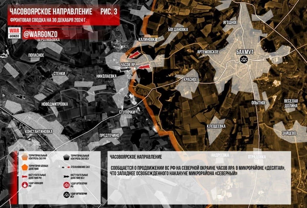 Часовоярское направление. Сообщается о продвижении ВС РФ на северной окраине Часов Яра в микрорайоне «Десятая», что западнее освобожденного накануне микрорайона «Северный», сообщает Telegram-канал Wargonzo.