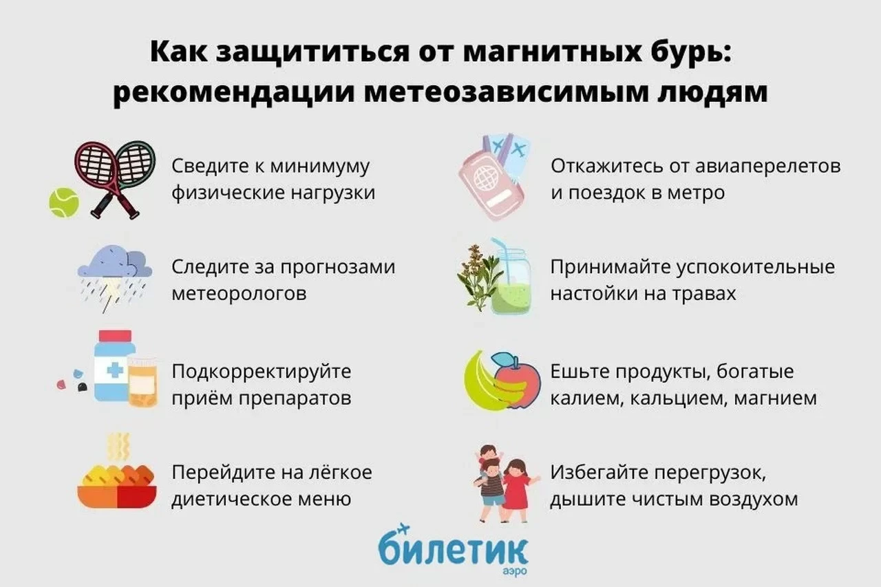 «Если мы знаем, что приближается магнитная буря, нужно принимать все назначенные препараты строго, если [речь идёт] о постоянном приёме каких-то лекарств. Особенно желательно следить за своим артериальным давлением. Людям с повышенным давлением стоит исключить крепкий кофе. Пить побольше воды - это всем актуально. Не планировать каких-то важных дел, длительных поездок, по возможности избегать стресса, высыпаться. И обязательно исключить вредные привычки: от алкоголя желательно отказаться всем, от курения - тоже. Можно на воздухе погулять, если есть возможность. Общие положения о здоровом образе жизни лучше соблюдать, не перенапрягаться, исключить вредную, жирную и тяжёлую пищу, особенно в вечернее время», - сказала Беляева. Ее слова приводит "Абзац".