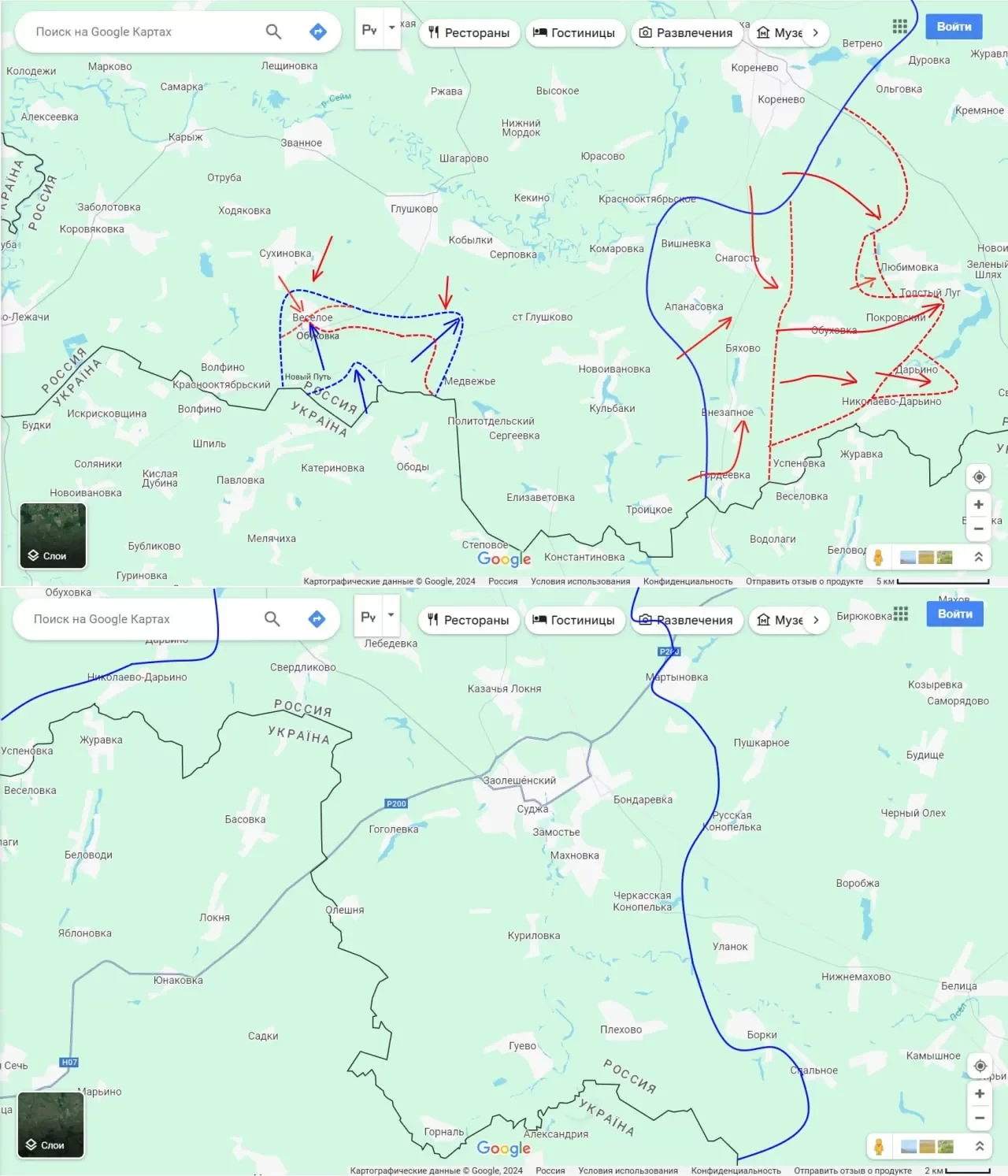 Некоторые источники сообщают, что штурмовые отряды Армии России заняли западную часть Любимовки и ведут бои в центре населённого пункта, а Толстый Луг вообще почти зачищен, однако эта информация пока что не находит подтверждения. Чуть южнее идут бои на подступах к Нижнему Клину, Дарьино и Николаево-Дарьино. До перерезания трассы Коренево-Суджа в районе Нижнего Клина или Свердликово пока что далеко.